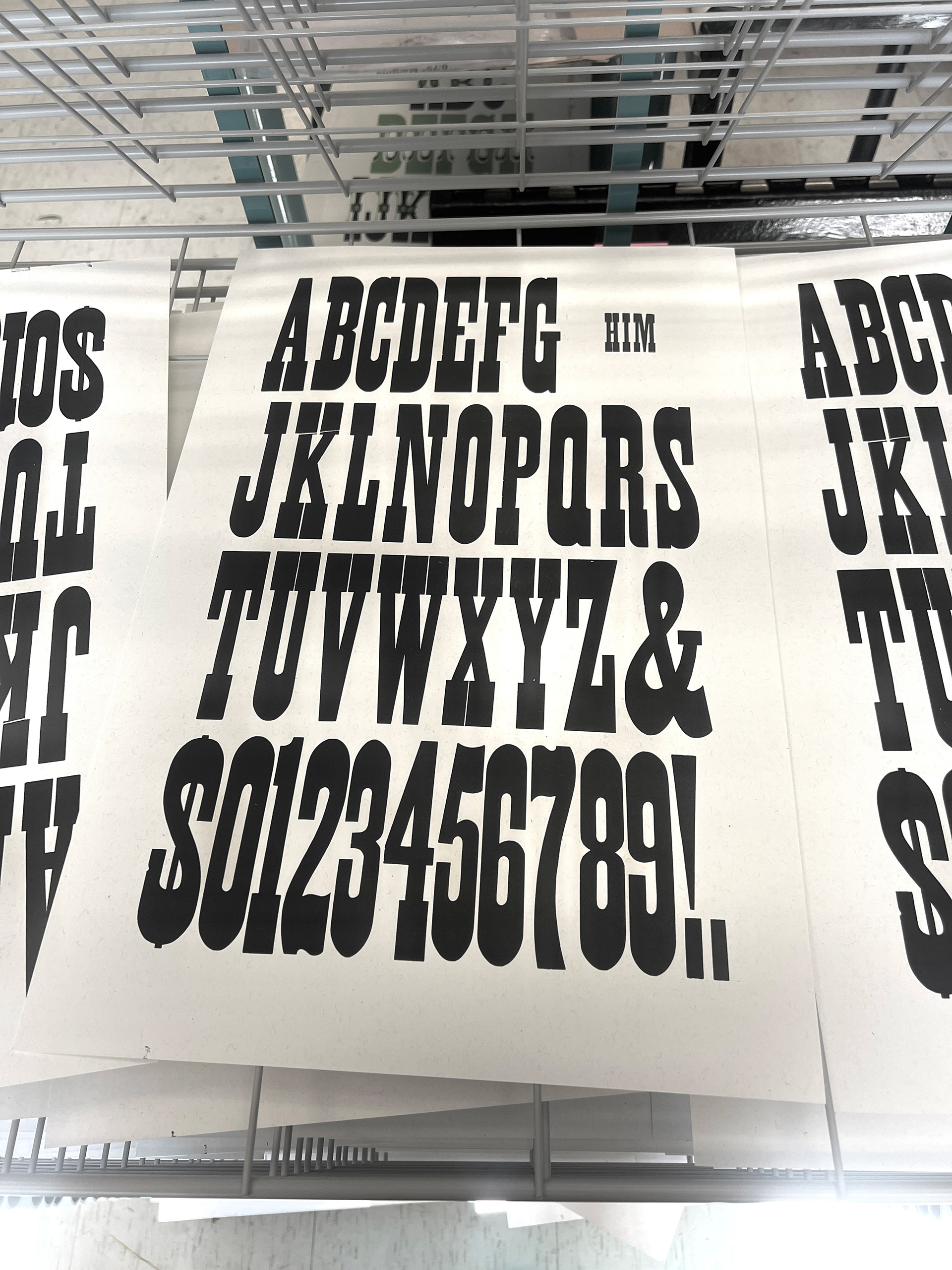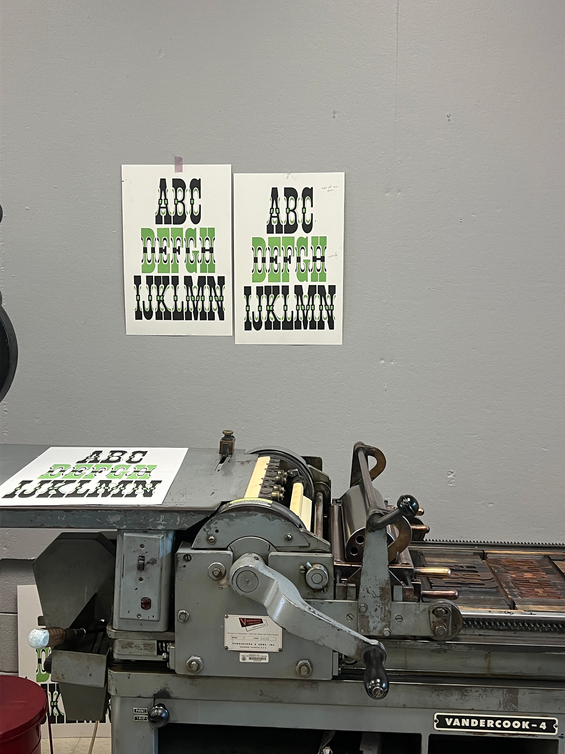 I began the summer with an ambitious first print: a two-layer chromatic. My goal was to give equal weight to both the original typeface and the chromatic layer, which I achieved through alternating their colors and print order as the rows descended. This approach required close attention to registration, along with many teeny tiny individual adjustments. Because the original ampersand was missing, we cut a new block to complete the final print.
