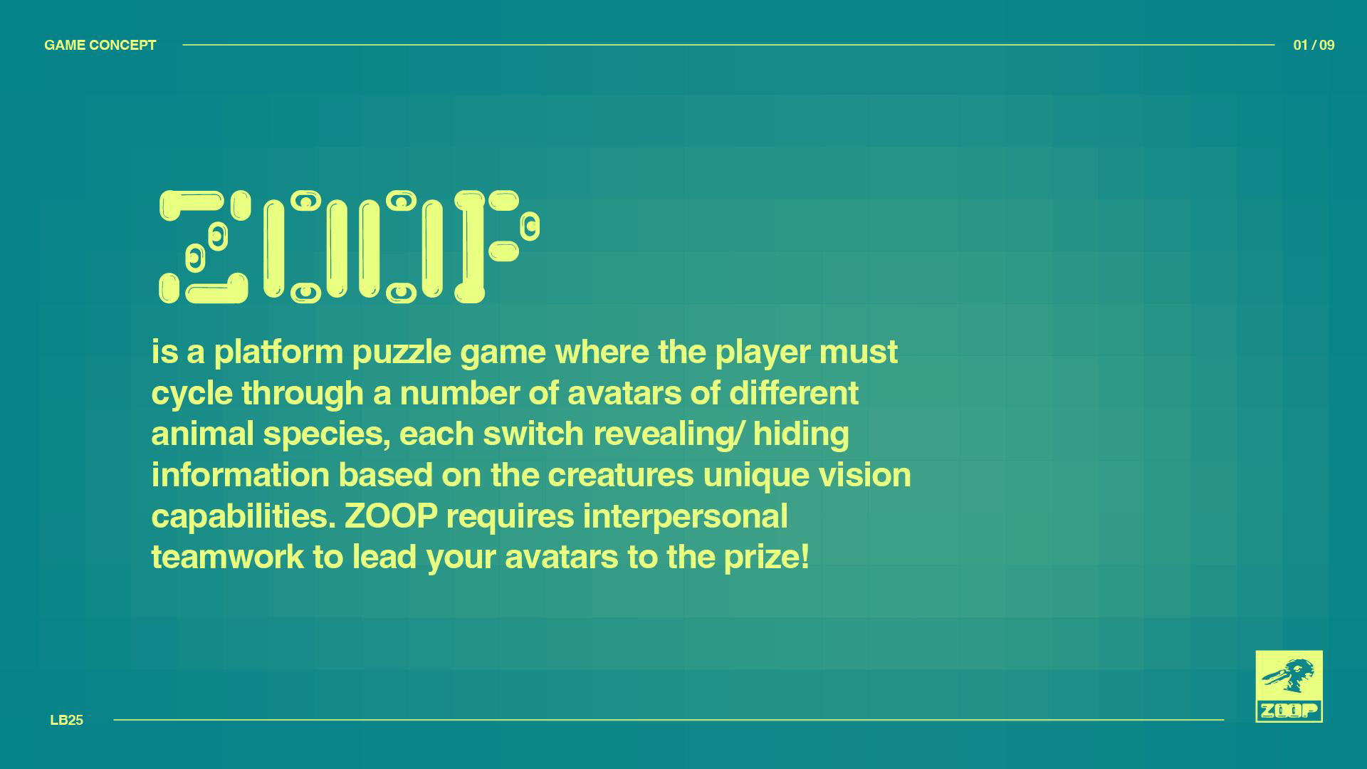 I wanted to expand the idea of simulating different animals perspectives into a different kind of game. This is where ZOOP was born!