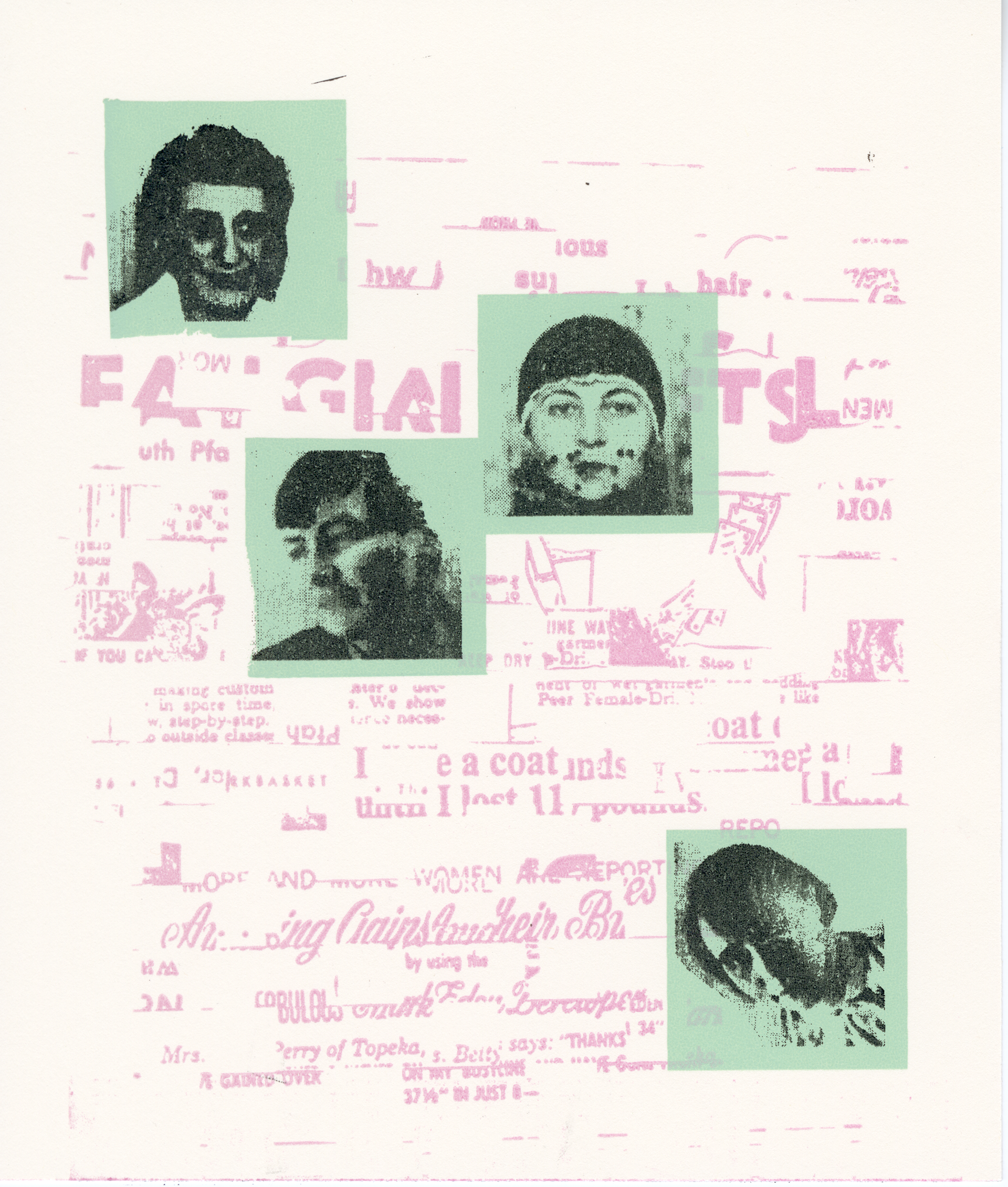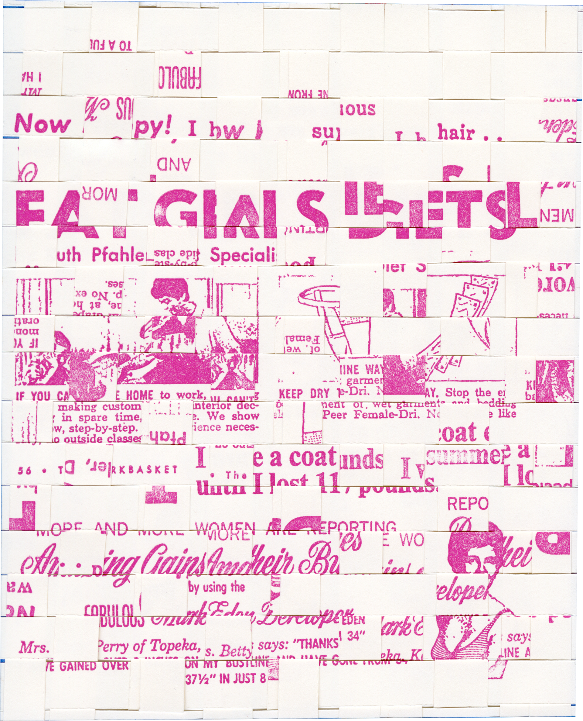 initially setting out to collage an artifact of art history, I chose a 1968 edition of The Workbasket as a commentary on the massive yet often invisible role of traditionally “domestic” and “feminine” craft within the canon (and within my own practice). However while scanning the material, I became overwhelmed by the misogynistic messaging embedded within what initially felt like a safe, intimate space for women. I collaged selections of these advertisements and printed letterpress with polymer plates. I then sought to embody the women of this era by adopting their techniques and persistence to re-collage the print. I used traditional weaving methods to create new negatives for additional plates, which were then reprinted. The final layers feature four women of the Bauhaus whose practices deeply inspire me and resonate with the conceptual framework of this piece. Their names are letterpress printed on the back. 6x7"