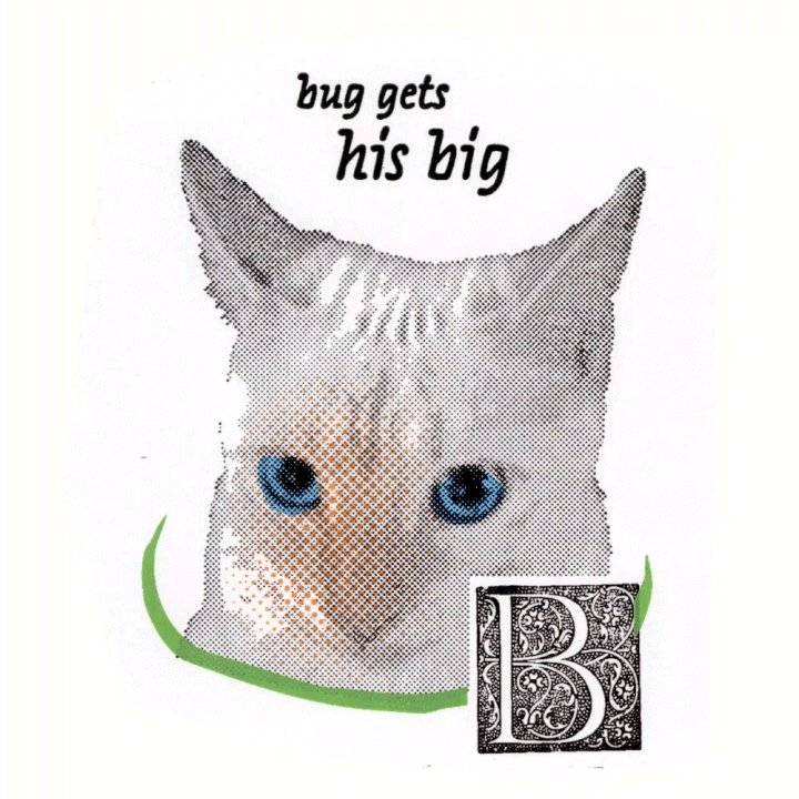 celebrating my kittens first birthday, this print is composed of 3 layers of silkscreen, and 2 layers of polymer plates printed letterpress. I then scanned my favorites in, and composited in After Effects. 10x10"