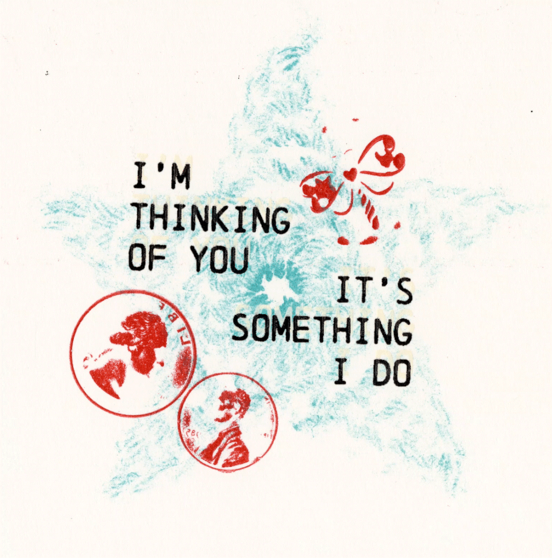 crocheted star and coins mounted on chipboard and printed letterpress. Screen print lyrics from It's Something I Do by Frog 4.5x4.5"