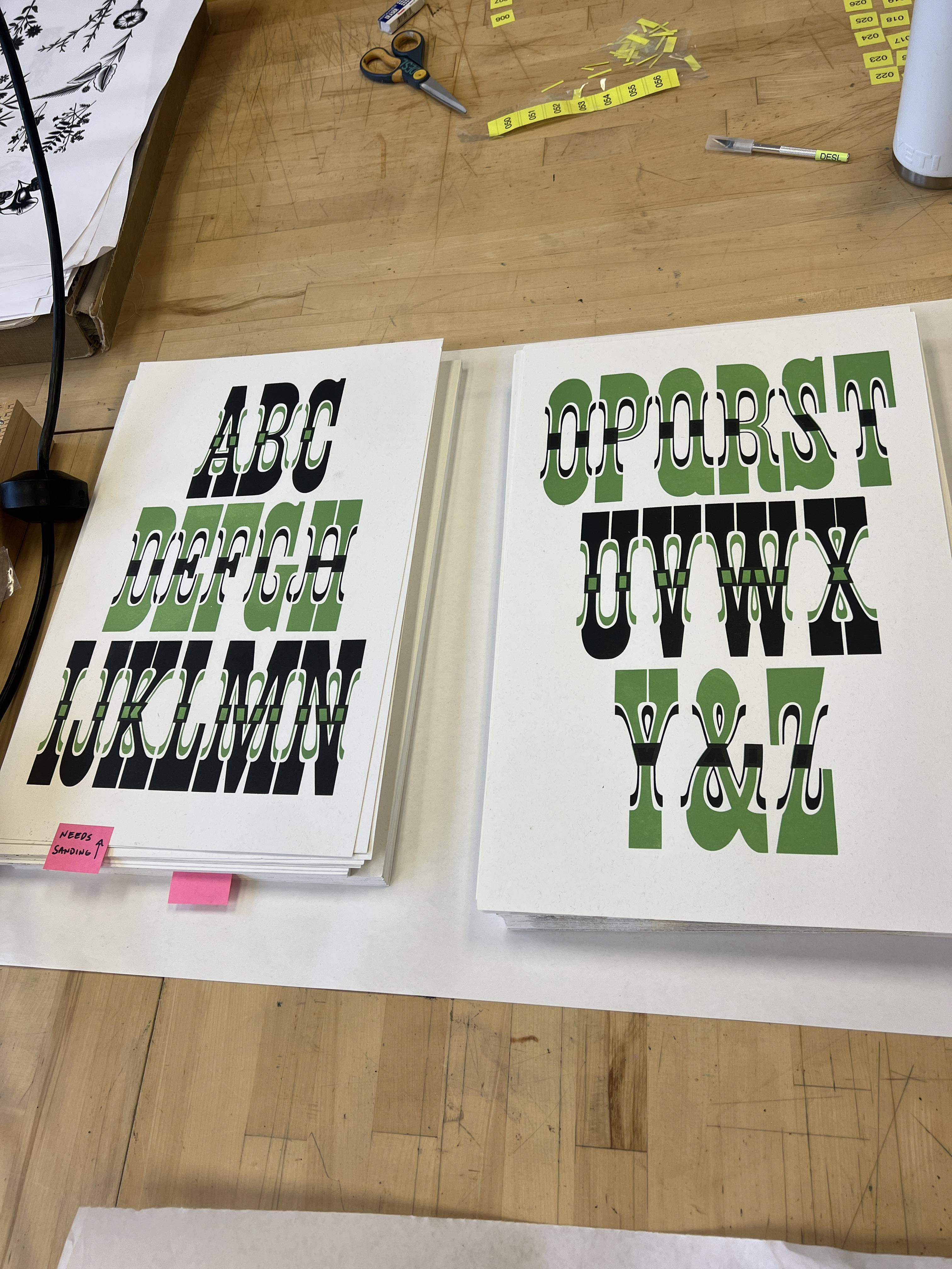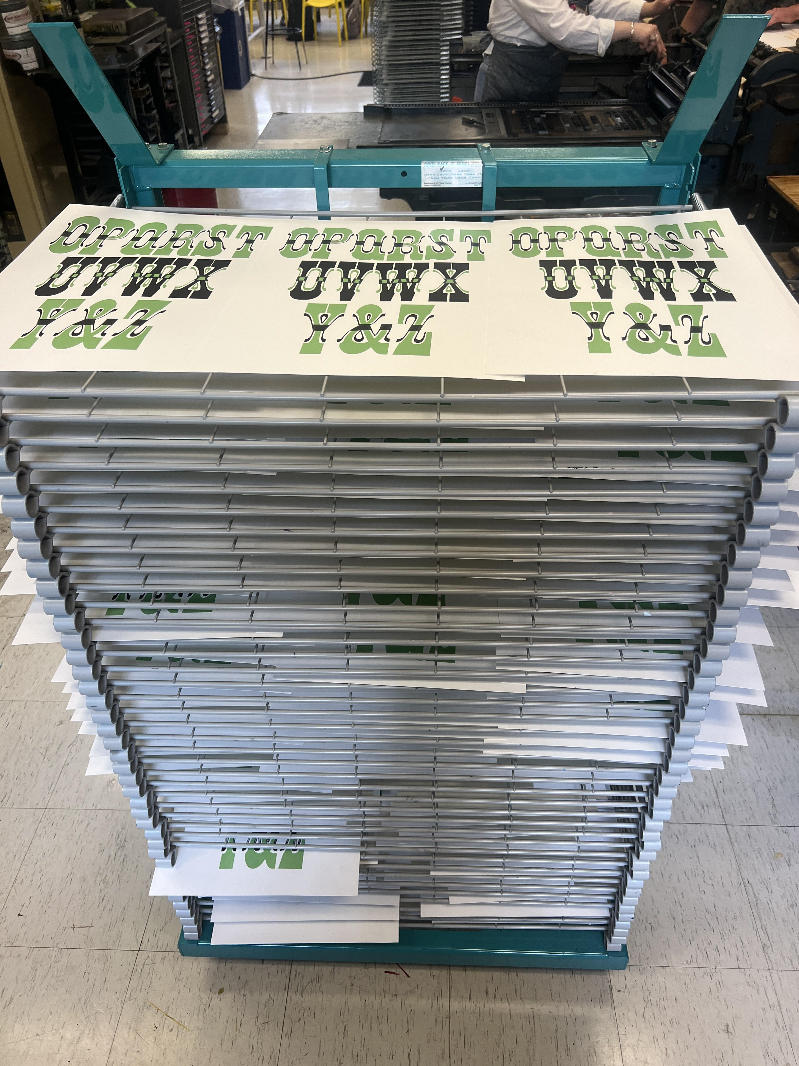 I began the summer with an ambitious first print: a two-layer chromatic. My goal was to give equal weight to both the original typeface and the chromatic layer, which I achieved through alternating their colors and print order as the rows descended. This approach required close attention to registration, along with many teeny tiny individual adjustments. Because the original ampersand was missing, we cut a new block to complete the final print.