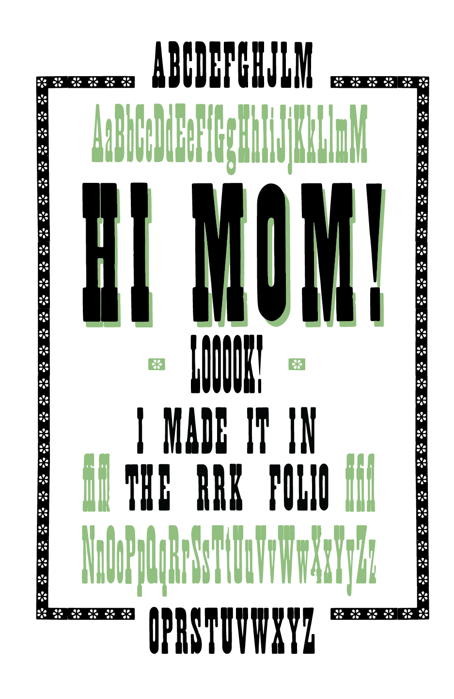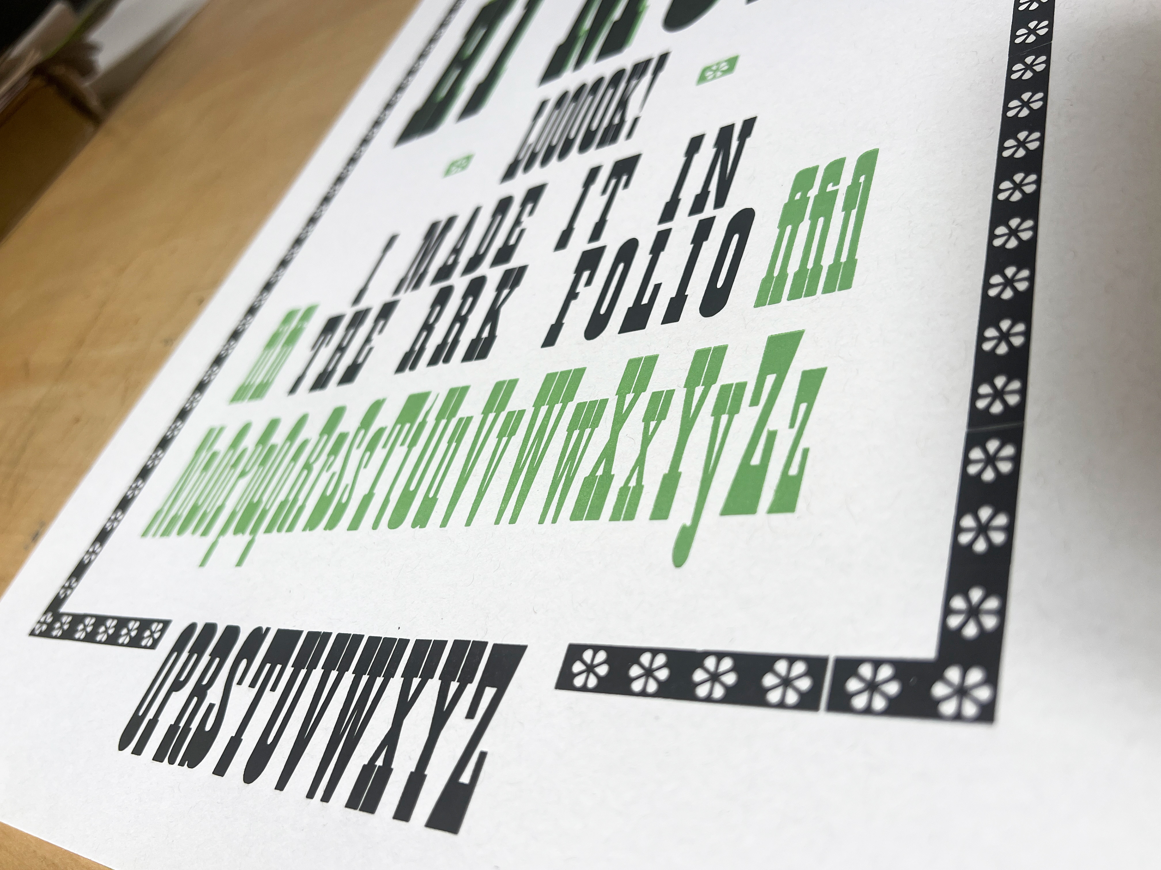 The original goal for this print was to use the rest of the French Antique No. 1 in 24 and 8 line. I also wanted to finish out all the variations of sizes in a final specimen. I thought it would be funny to be self-referential and a little personal, as my mom is a gardener and I was immediately drawn to the flower border. Moving back into 2 layers was exciting and allowed me to explore more compositions.