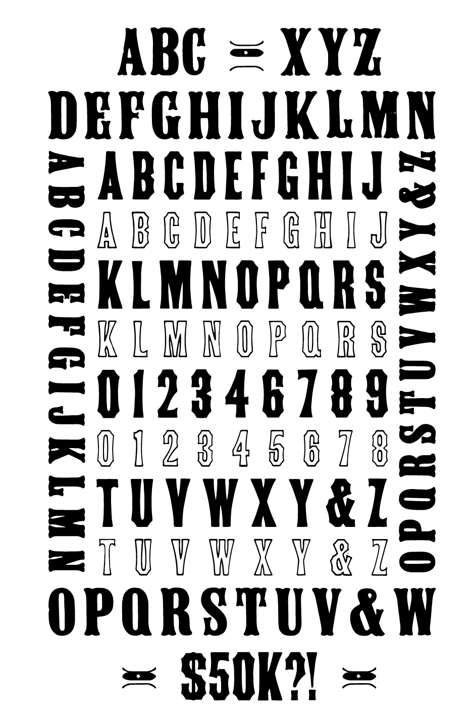 With this print, I wanted to challenge myself to arrange as many typefaces on a specimen as possible. Working with similar styles and sizes and following a strict geometric pattern allowed me to do so. The $50k is referencing the acquisition cost of the collection to the Harry Ransom center. I also wanted to explore how I could entirely fill the page without becoming overwhelming.