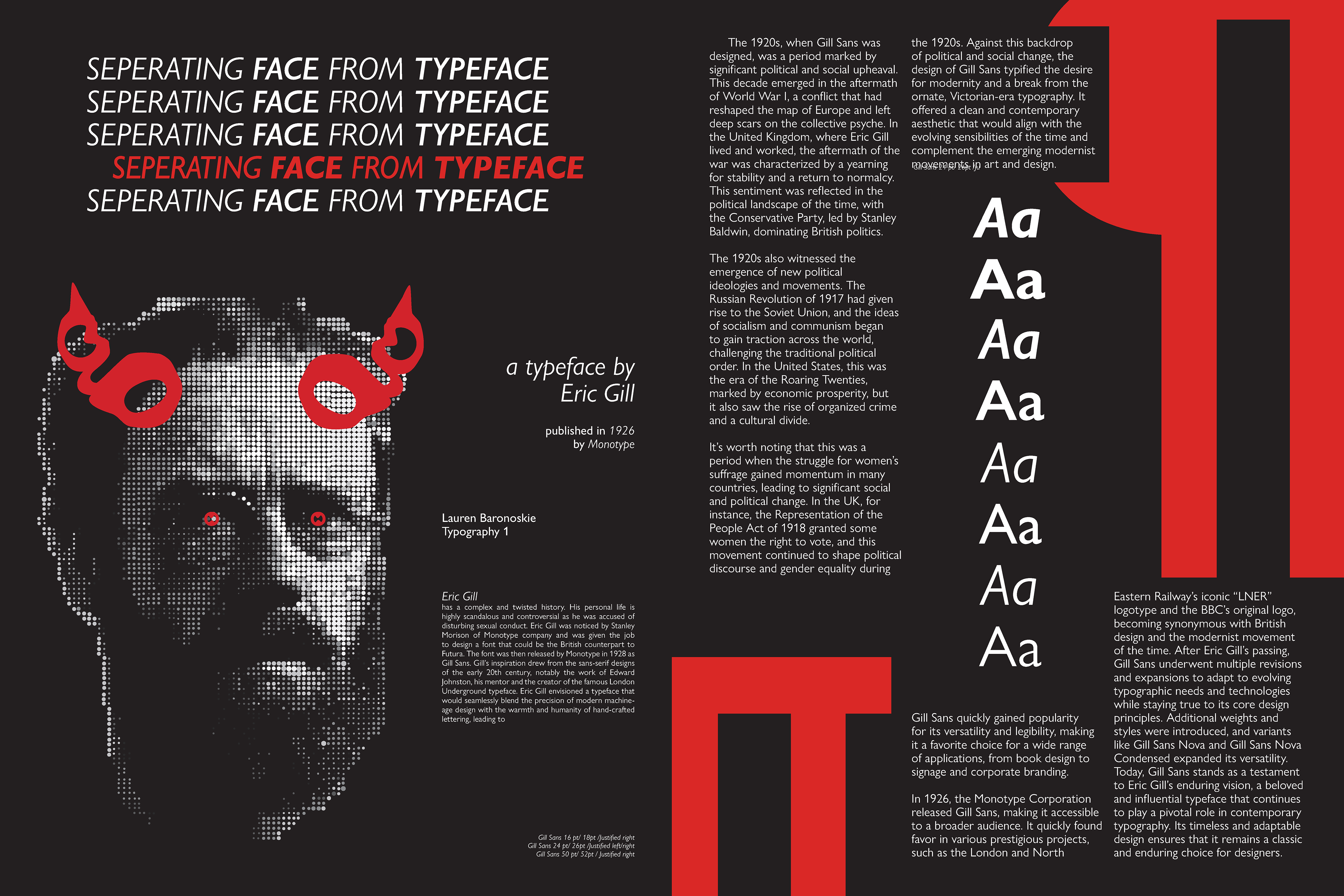 This is where ‘Separating Face from Typeface' was born; an effective way to highlight both the positive impacts and influences of Gill Sans while also acknowledging and educating about the disturbing past of Eric Gill.