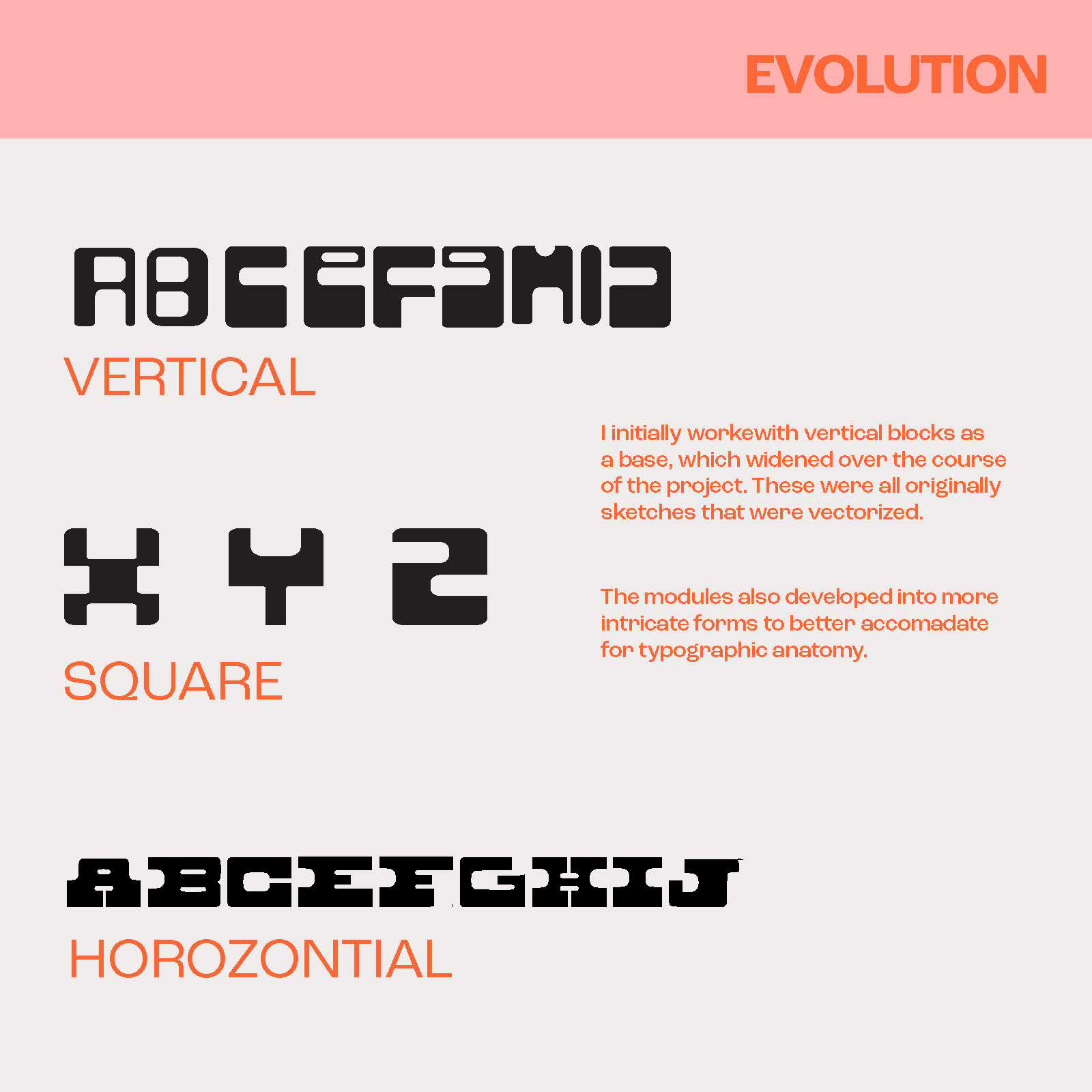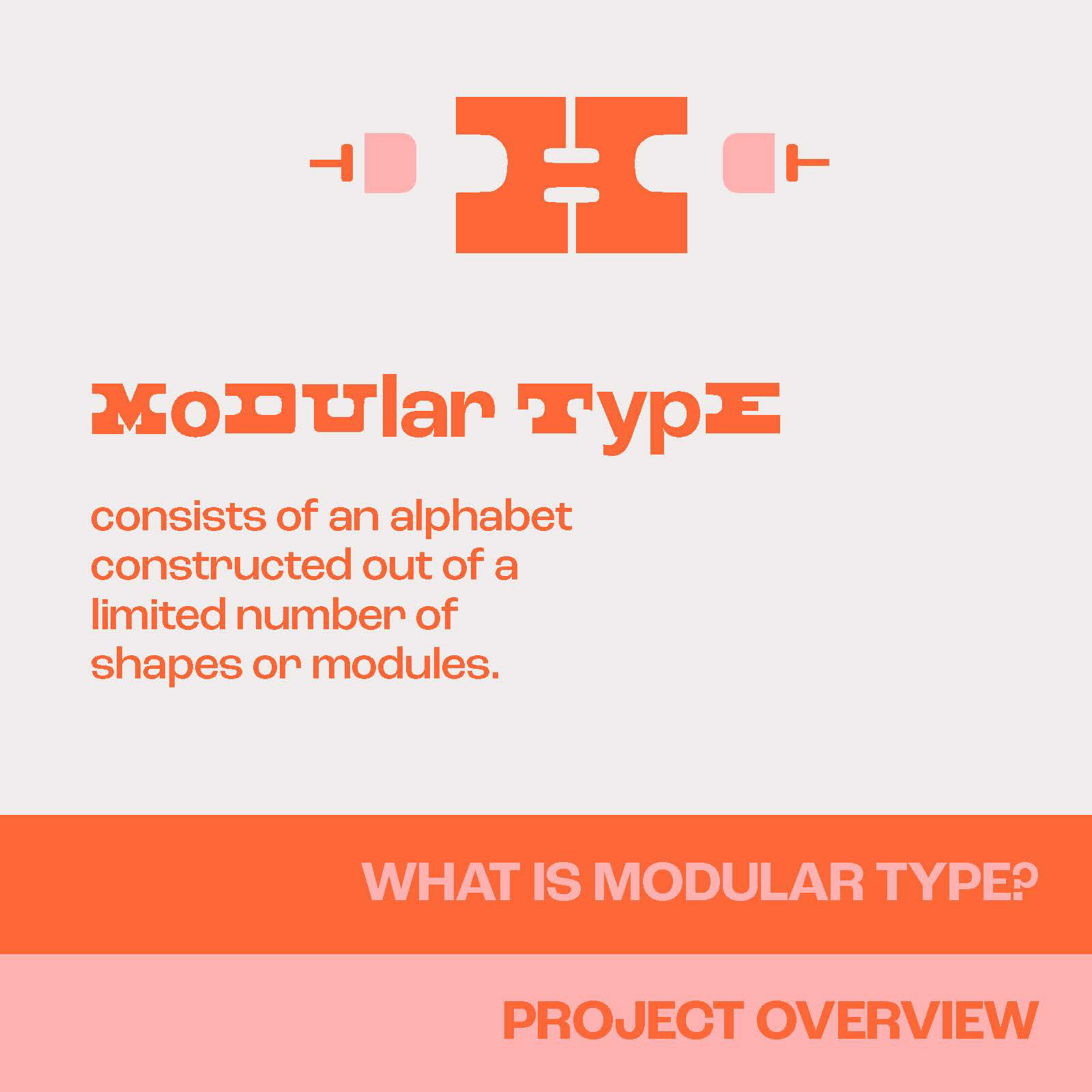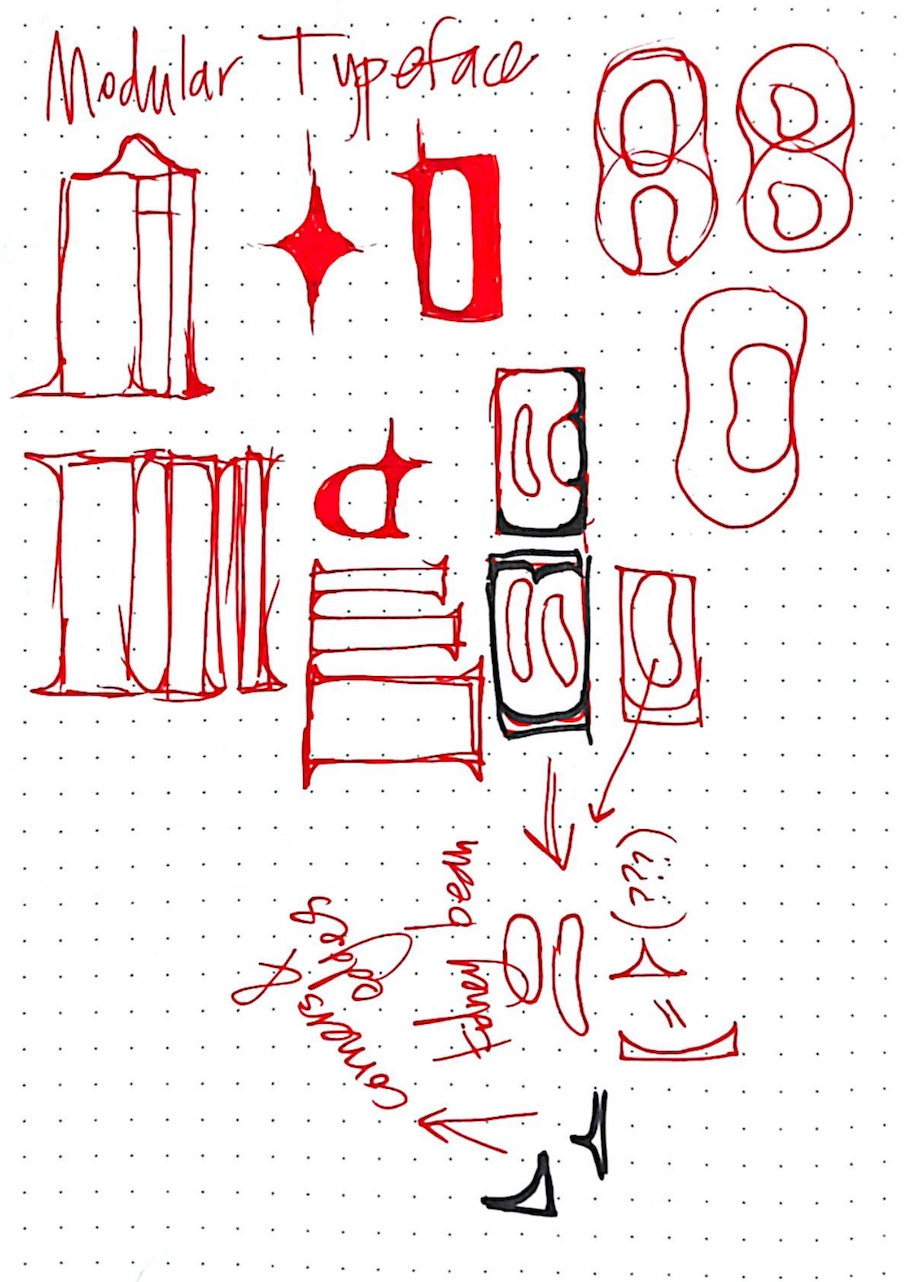 brief: use the context of a modular letter construction to create a prototype for a modular font. A minimum of 26 upper-case or lower-case characters (you are not required to create both). You may choose to create a unicase font combining typical characteristics of upper and lower case characters. Your letterforms must be modular/ rational/repeatable forms
